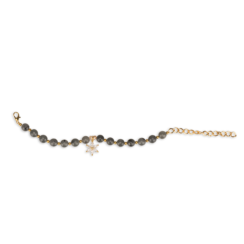 A chic bracelet designed with glossy black faceted beads and golden spacers, finished with a delicate floral AD stone charm at the center.