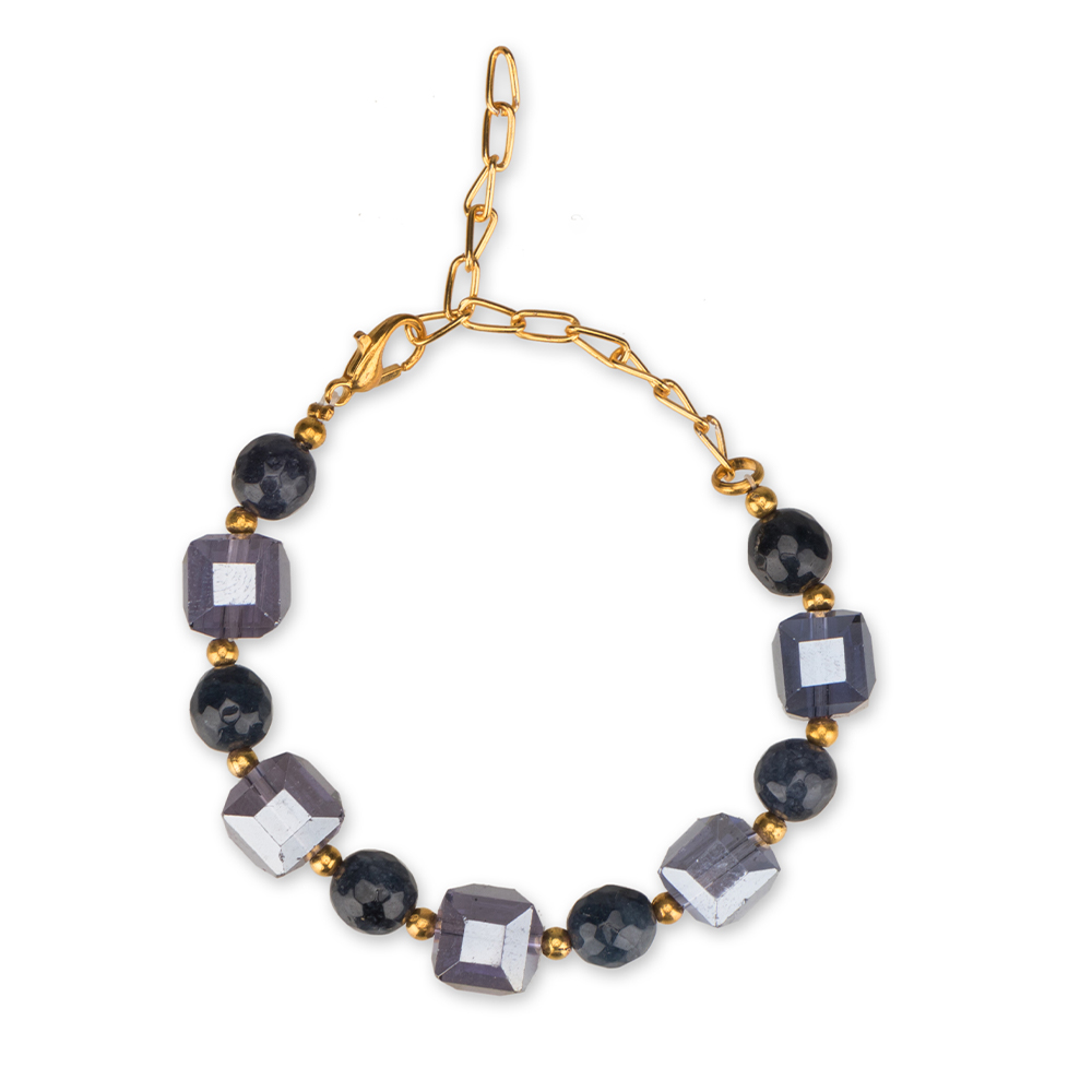 This bracelet combines the deep, rich tone of polished, dark beads with the geometric precision of large, square, faceted gray crystals. The contrasting shapes and textures create a modern and bold look, while the gold accents tie the design together. This piece is a great choice for adding a touch of contemporary flair to any outfit.
